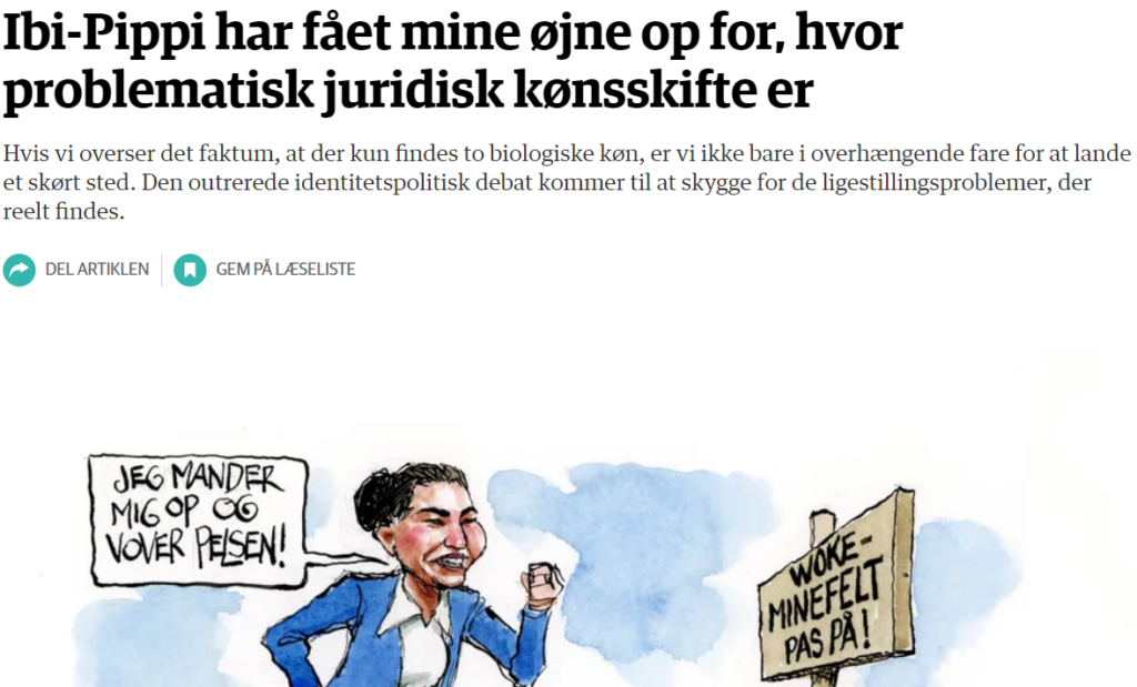 Marie Bjerres kronik i Jyllandsposten kan læses helt gratis – udenom betalingsmuren – her: https://jyllands-posten.dk/debat/kronik/ECE17337761/ibipippi-har-faaet-mine-oejne-op-for-hvor-problematisk-juridisk-koensskifte-er/