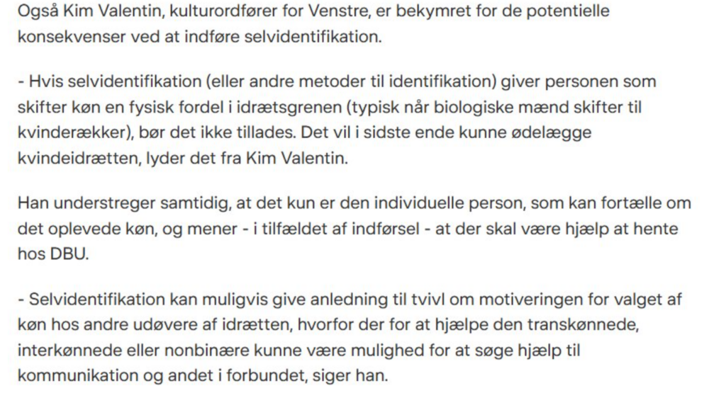 Artiklen kan læses her: https://www.dr.dk/sporten/fodbold/splittelse-i-folketinget-om-transkoennet-deltagelse-i-fodbold