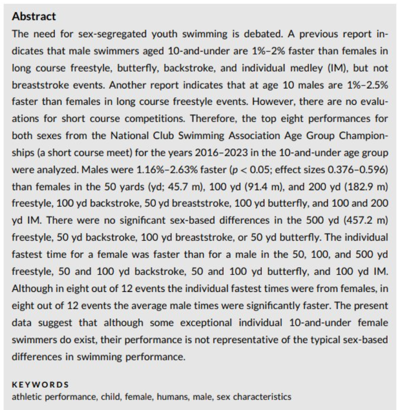 Undersøgelsen har overskriften “Sex-based differences in swimming performance in 10-years-old-and-under athletes in short course national competition”.