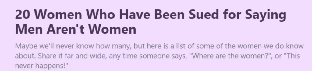 Her er listen over de 20 kvinder – inkl. mig: https://womensnewsnetwork.substack.com/p/20-women-who-have-been-sued-for-saying