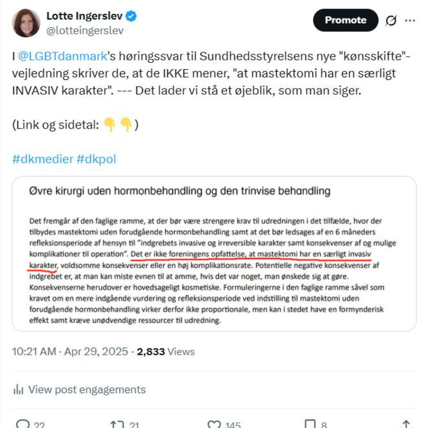 Den 29. april skrev jeg (både på Facebook og på X.com) om min opdagelse i LGBT+ Danmarks høringssvar. Fx her på X.com: