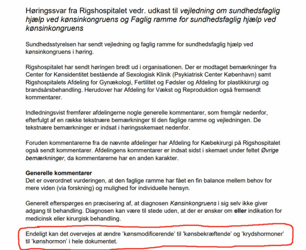 Rigshospitalet [inkl. Center for Kønsidentitet (for de voksne) og Sexologisk Klinik (for børn og teenagere)] foreslår i deres høringssvar til Sundhedsstyrelsens nye “kønsskifte”-vejledning, at ordet “KRYDShormoner” erstattes af ordet “KØNShormon” alle steder i vejledningen. Og ordet “kønsMODIFICERENDE” bryder Rigshospitalet sig heller ikke om. Det ord foreslår de erstattet med “kønsBEKRÆFTENDE”.