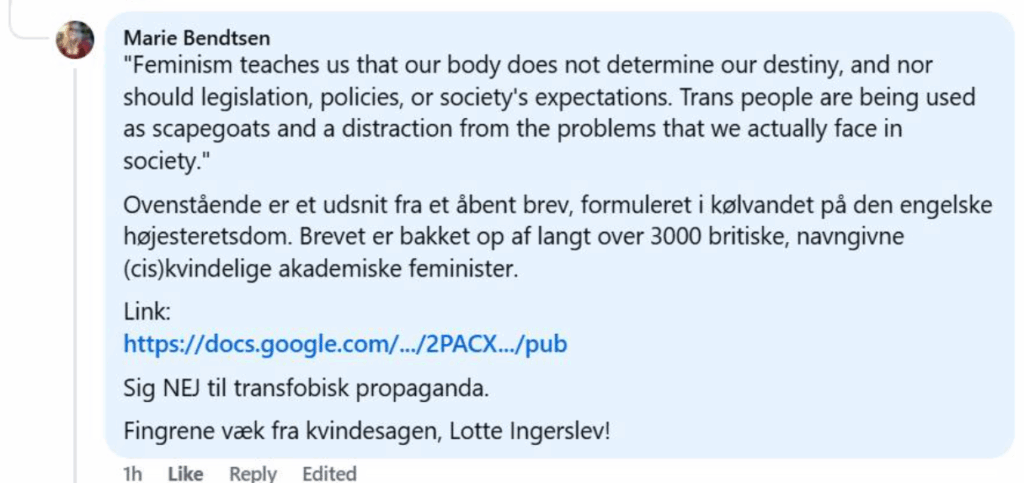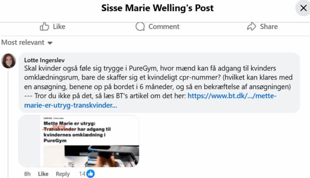 Første screenshot herunder er en kommentar, som jeg skrev til et opslag fra Sisse Marie Welling.