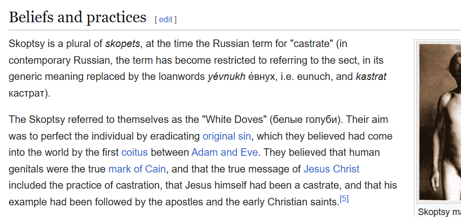 Der er også paralleller til den russiske kastrations-sekt Skoptsy fra 1800-tallet. (Læs mere om den på Wikipedia her >>)