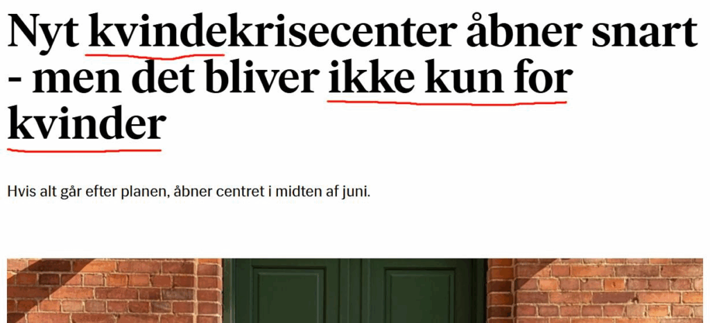 På det nye kvindekrisecenter Haslevhus’ hjemmeside kan man se, at der står, at de “tager imod kvinder med lige CPR-nummer” – altså også mænd, der har skaffet sig juridisk kønsskifte til “kvinde”.