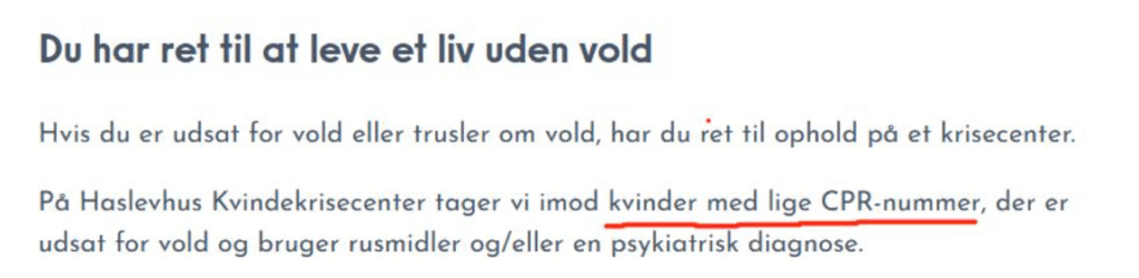 Her på det nye kvindekrisecenters hjemmeside, kan man læse, at “På Haslevhus Kvindekrisecenter tager vi imod kvinder med lige CPR-nummer”: https://www.forenedecare.dk/social/haslevhus/