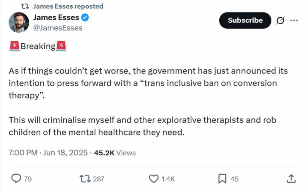Et forbud mod “omvendelsesterapi” vil *understøtte* det, der *i virkeligheden* er medicinsk og kirurgisk “omvendelsesterapi” – lemlæstelse og sterilisering af børn og unge, der ellers ville vokse op og blive homoseksuelle.