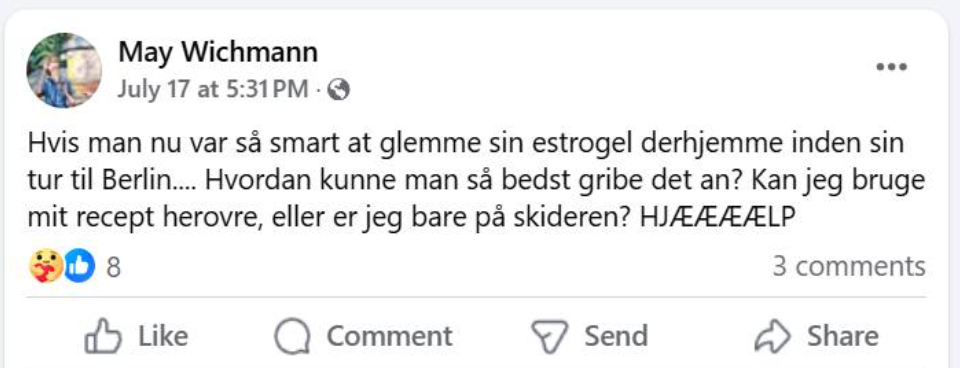 “Hvis man nu var så smart at glemme sin estrogel derhjemme inden sin tur til Berlin…. Hvordan kunne man så bedst gribe det an? Kan jeg bruge mit recept herovre, eller er jeg bare på skideren? HJÆÆÆÆLP.”
