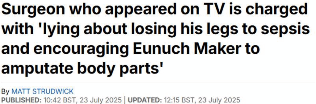 Her er dagens Daily Mail-artikel om kirurgen med de afskårne ben: https://www.dailymail.co.uk/news/article-14932111/surgeon-charged-fraud-amputation-operations.html