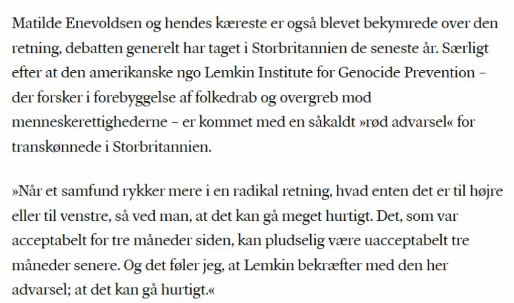Efter den famøse højesteretsdom er der nærmest optræk til “genocide” i Storbritannien, fortæller den kvindekøns-imiterende mand “Matilde” Enevoldsen. Den skræmmevision stiller WA ingen spørgsmål til.