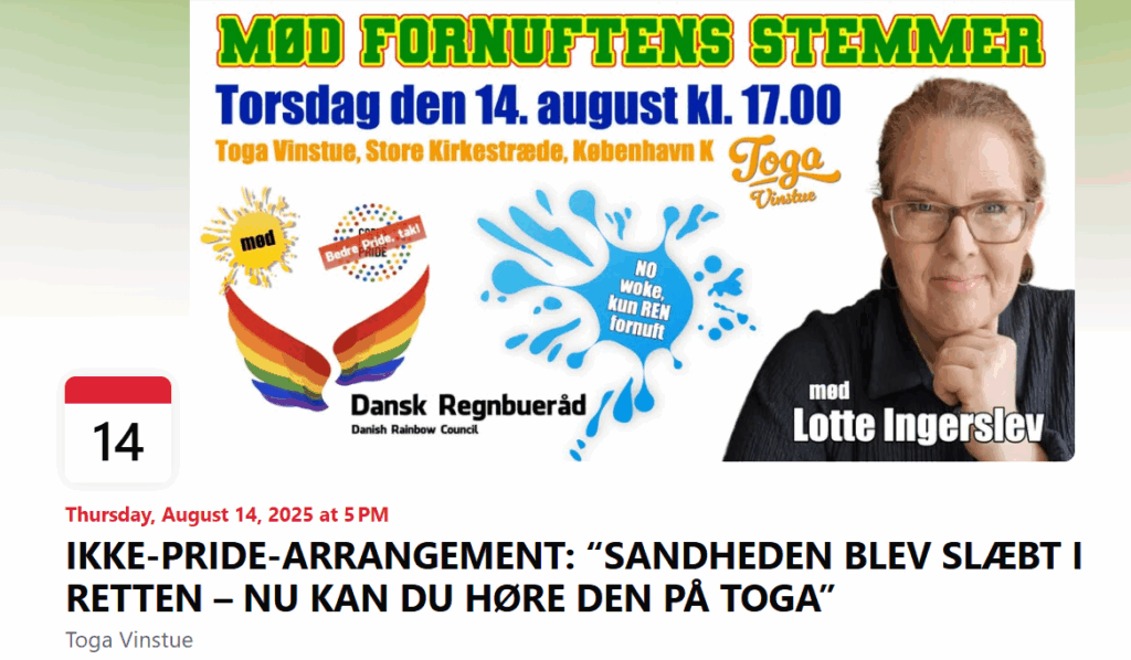 Efter interviewet kan du møde Dansk Regnbueråd – forkvinde Lis Lynge, bestyrelsesmedlem Ivan Hemmingsen og næstformand Jesper W. Rasmussen – stille spørgsmål, få en snak og høre mere om, hvordan vi sammen kan sætte en stopper for tidens kønsideologiske vanvid.