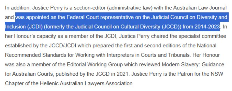 Her er dommer Melissa Anne Perrys profil på den australske føderale rets hjemmeside, hvor ovenstående screenshot er fra: https://www.fedcourt.gov.au/about/judges/current-judges-appointment/current-judges/perry-j