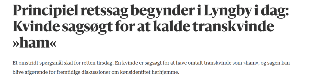 Læs artiklen her: https://www.berlingske.dk/samfund/principiel-retssag-begynder-i-lyngby-i-dag-kvinde-sagsoegt-for-at-kalde-transkvinde-ham