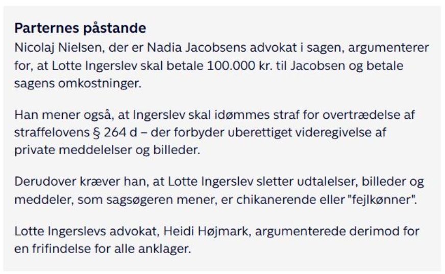 Nicolaj Nielsen, der er Nadia Jacobsens advokat i sagen, argumenterer for, at Lotte Ingerslev skal betale 100.000 kr. til Jacobsen og betale sagens omkostninger.